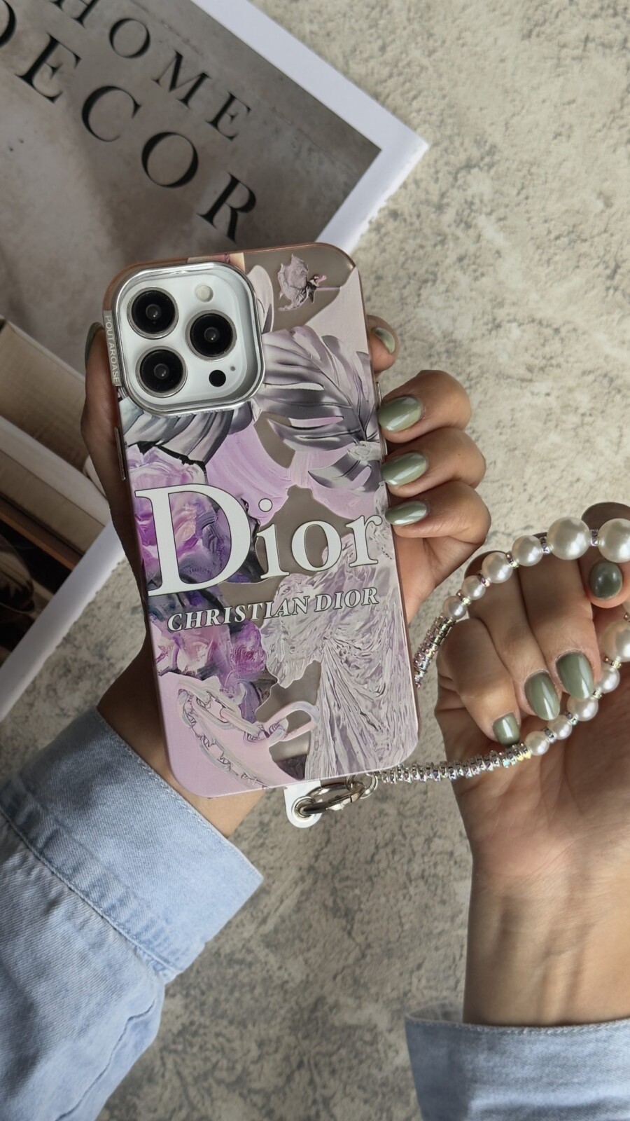 قاب موبایل آیفون شنل گل اسپرینگ تایم نگین مروارید + بند ست