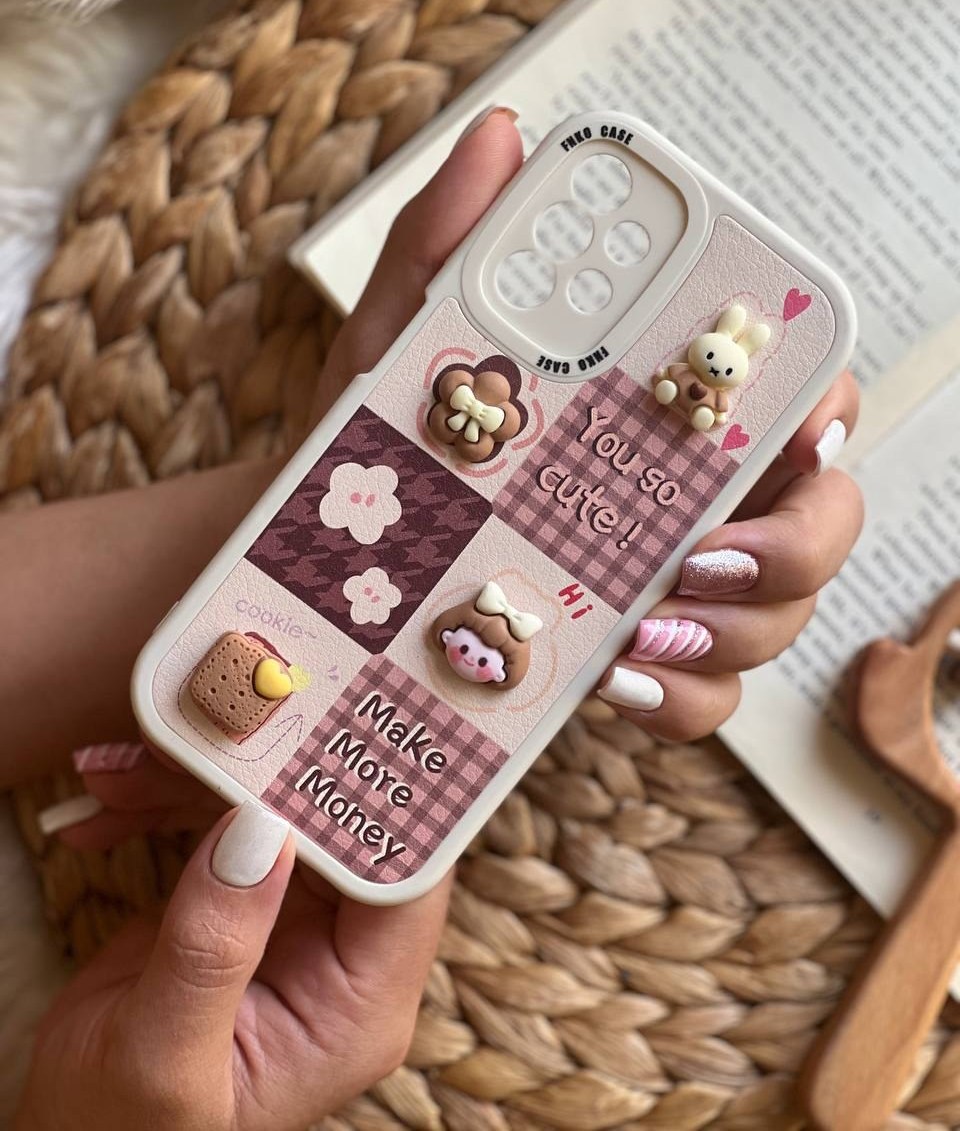 قاب موبایل آیفون دختر و بیسکوئیت برجسته قهوه ای کرم محافظ لنزدار