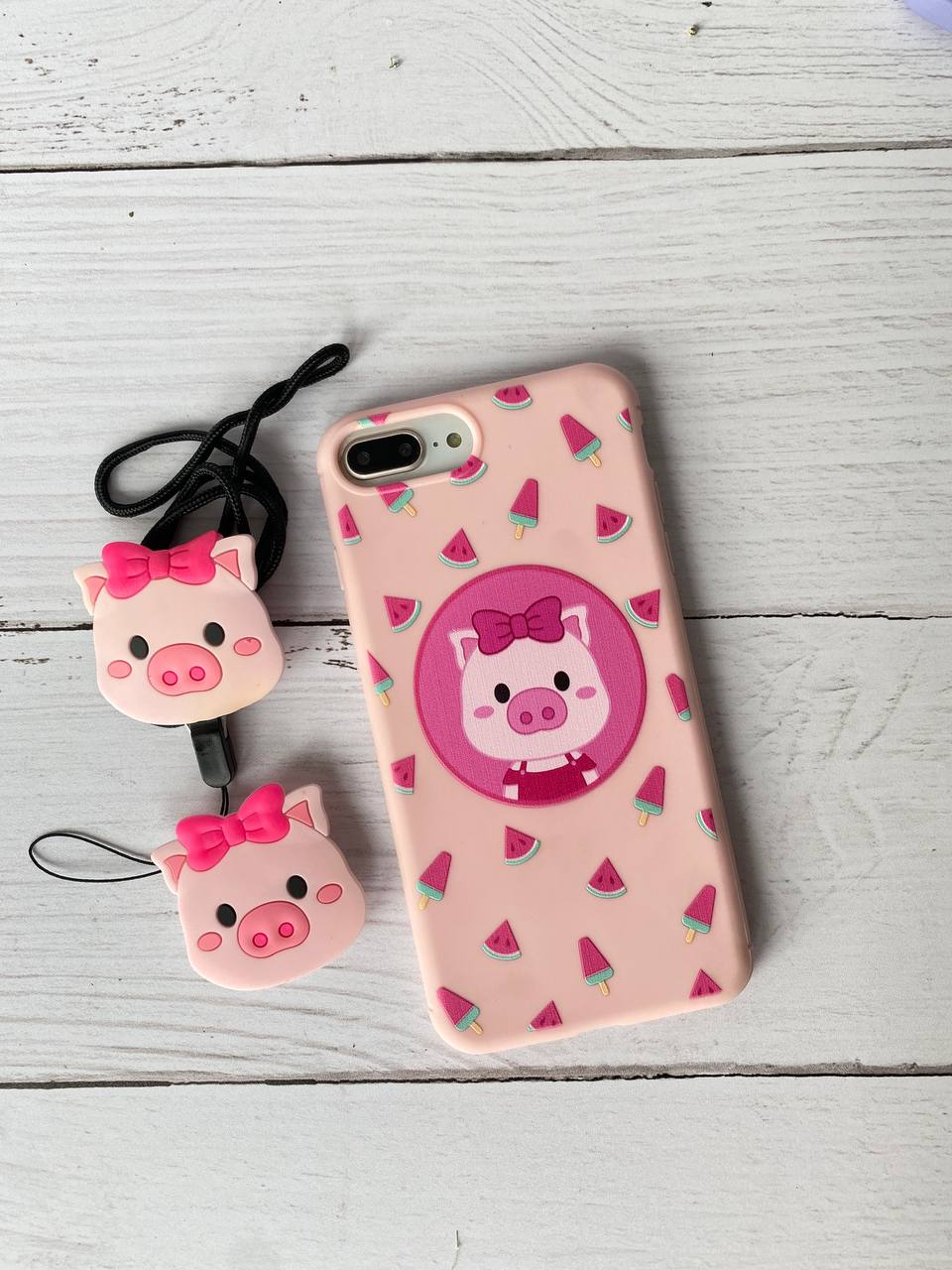 قاب موبایل آیفون خوک هندونه صورتی + پاپ سوکت و بند