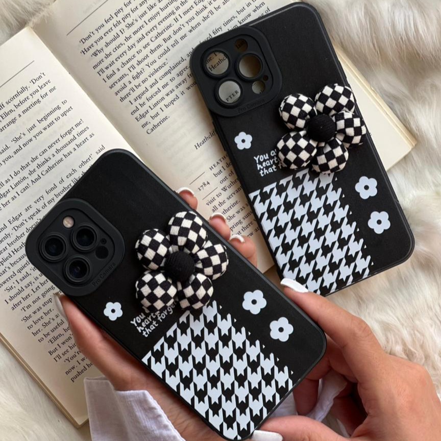 قاب موبایل آیفون گل شطرنجی بالشتی سیاه و سفید