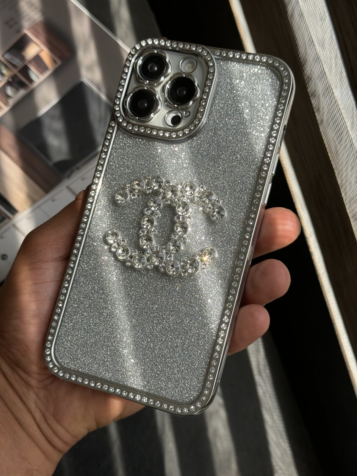 قاب موبایل آیفون شنل نگین دار برجسته براق نقره ای