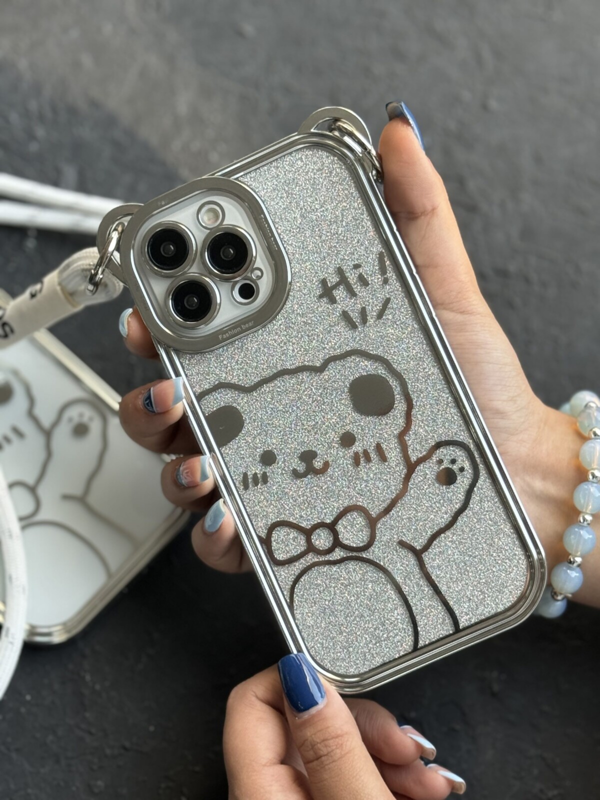 قاب موبایل سلام خرسی شاینی نقره ای + بند بلند آویز