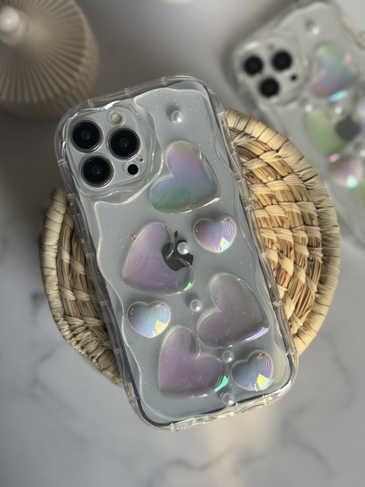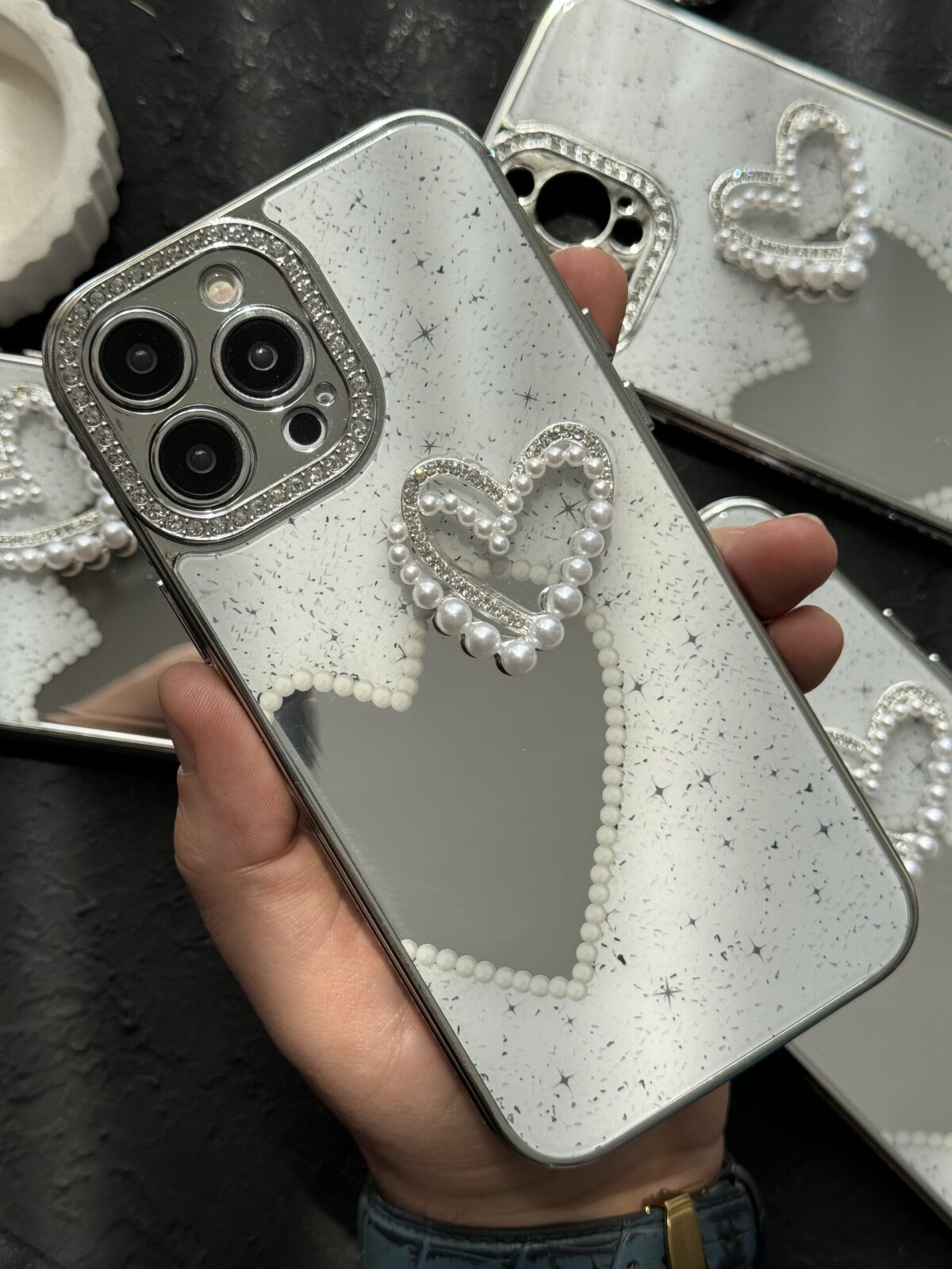 قاب موبایل آیفون پولکی نقره ای قلب مروارید برجسته