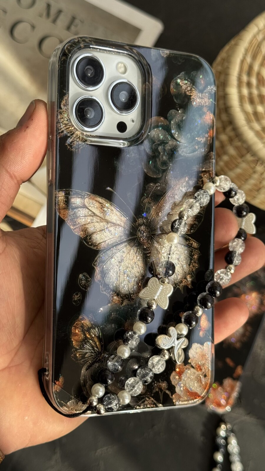 قاب موبایل آیفون پروانه ترنسپرنت مشکی پولکی طلایی