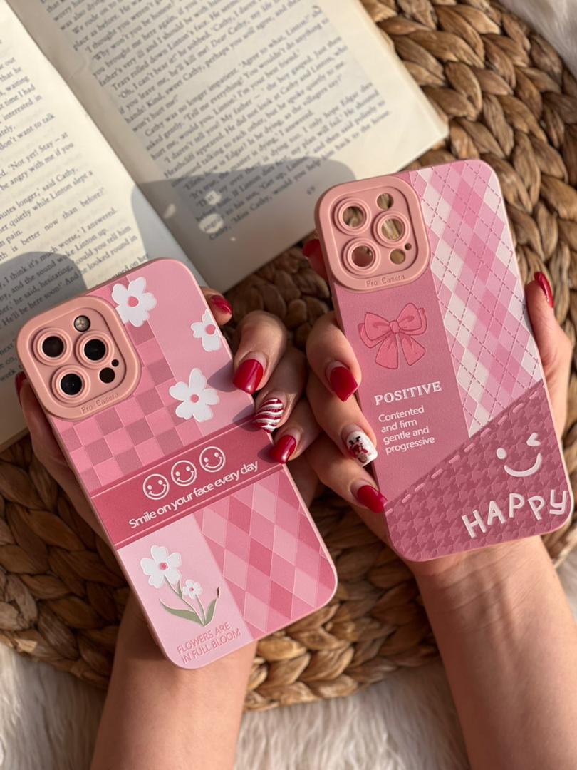 قاب موبایل آیفون سری لبخند صورتی چهارخونه محافظ لنزدار
