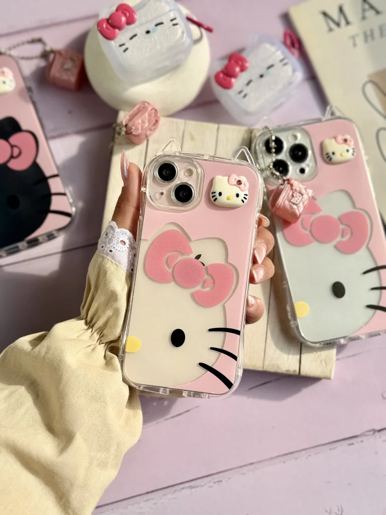 قاب موبایل ( آیفون – سامسونگ ) گربه پاپیون بزرگ آیینه ای صورتی + بندست