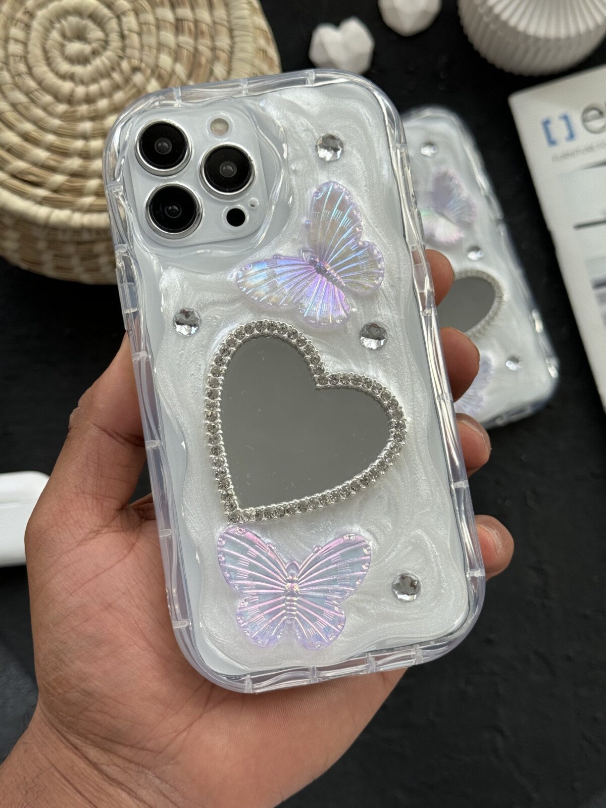 قاب موبایل آیفون آیینه قلبی پروانه برجسته