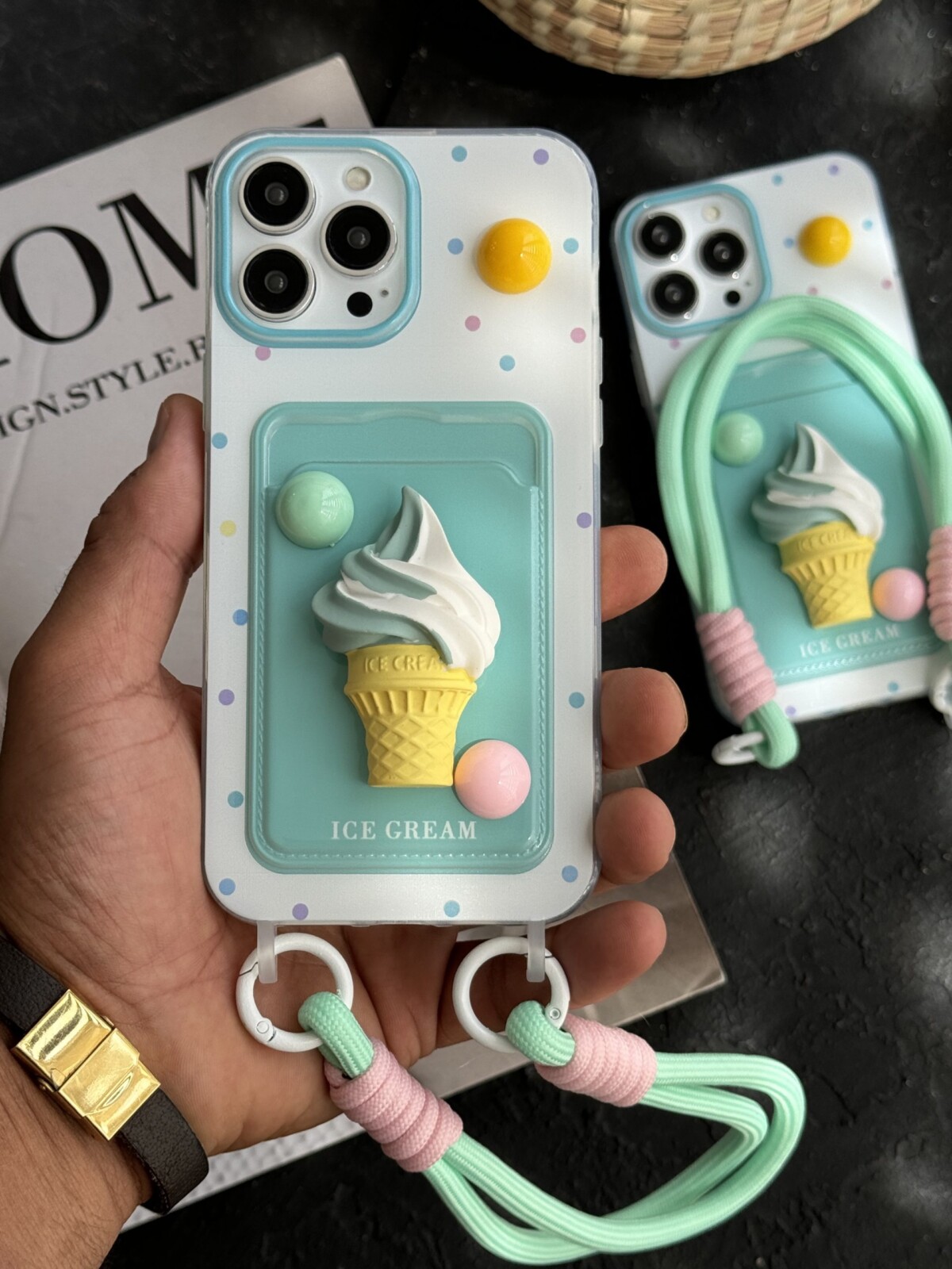 قاب موبایل آیفون بستنی قیفی دو رنگ جاکارتی بند ست