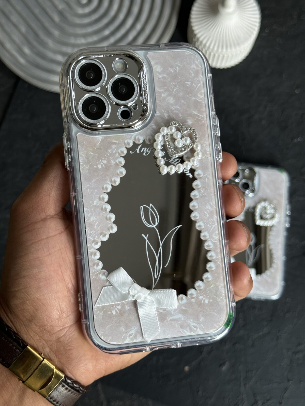 قاب موبایل آیفون دوقلب آیینه ای گل لاله