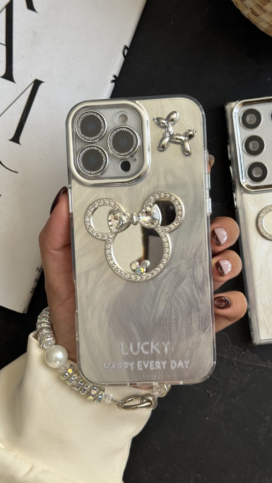 قاب موبایل ( آیفون – سامسونگ ) میکی اسکوییکی داگ آیینه ای نگین دار + بندست