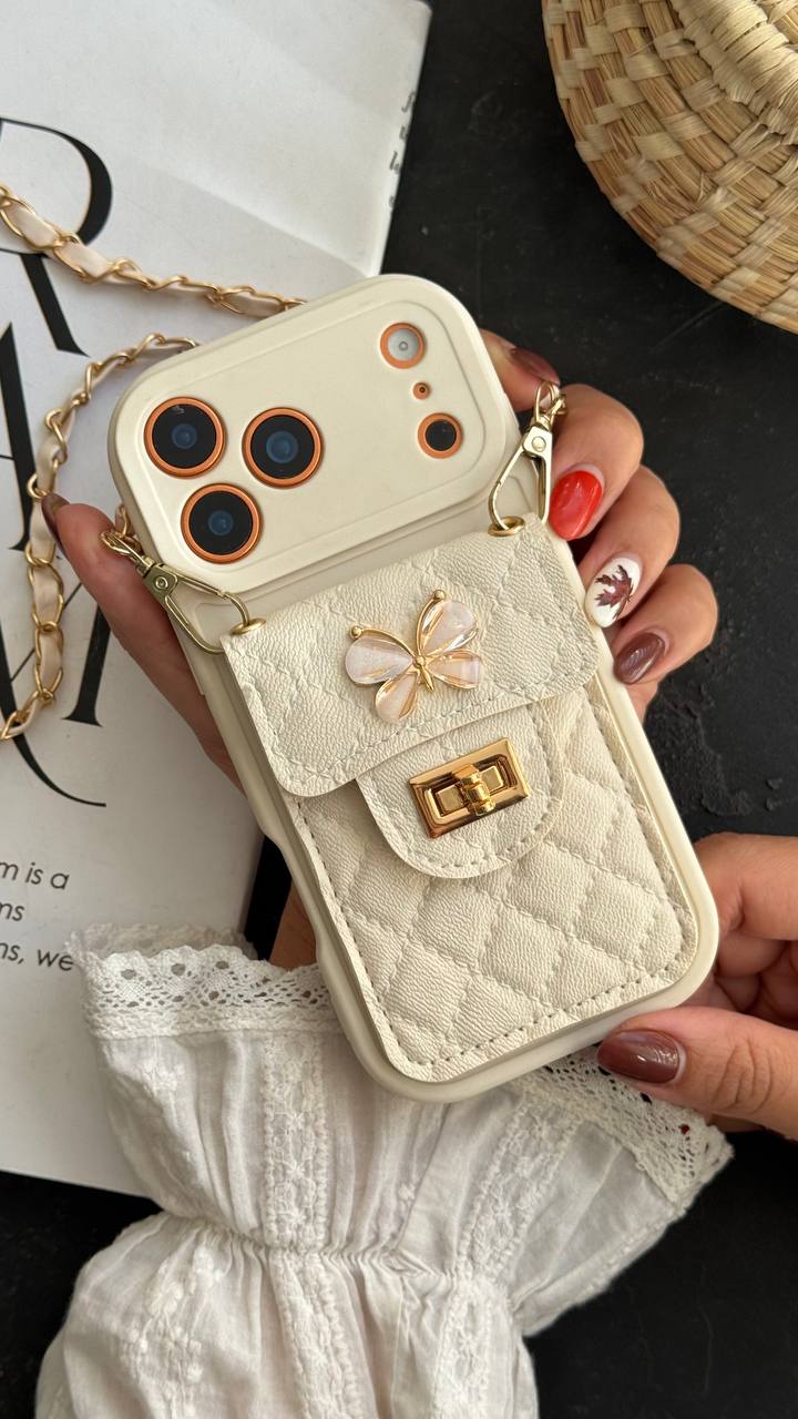 قاب موبایل ( آیفون – سامسونگ ) بند زنجیری بلند بالشتی پروانه ای جاکارتی دار
