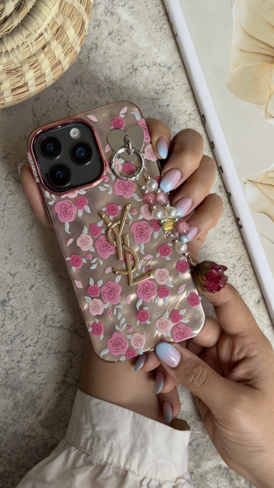 قاب موبایل ( آیفون – سامسونگ ) سن لورن شکوفه گل رز + آویز گل رز