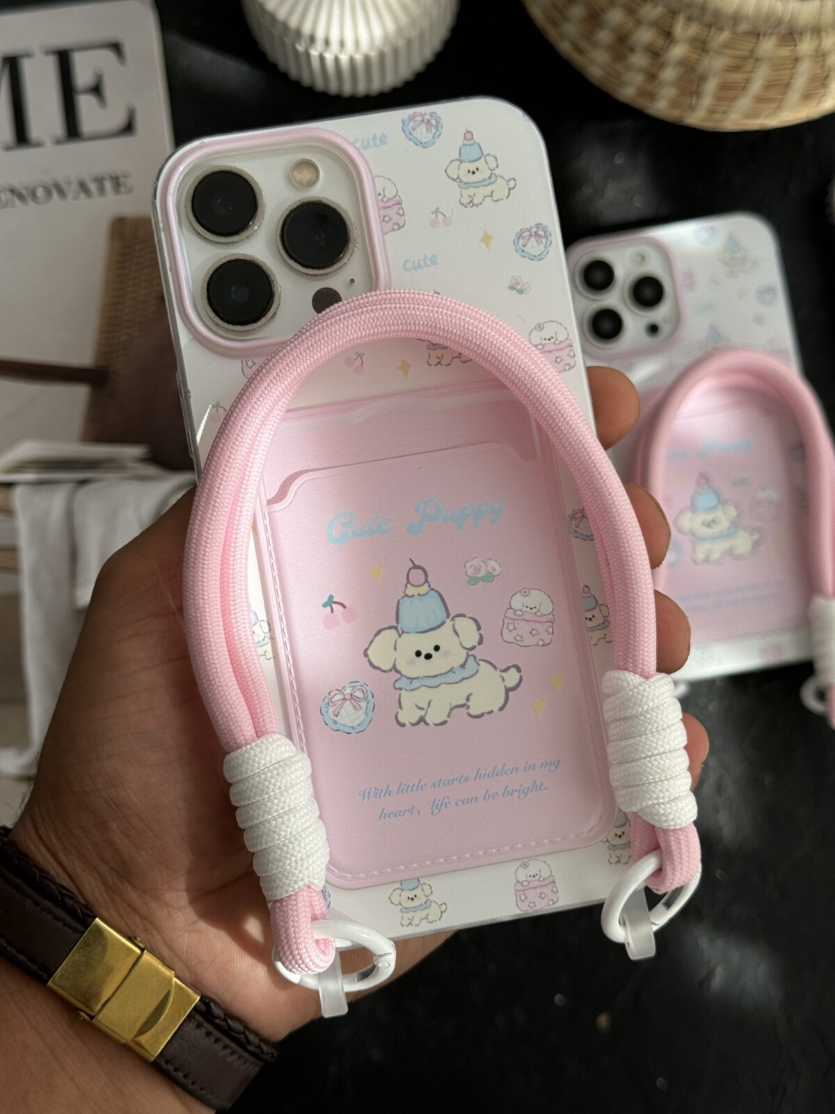 قاب موبایل آیفون سگ پاپی شکلاتی آیینه ای بند کوتاه