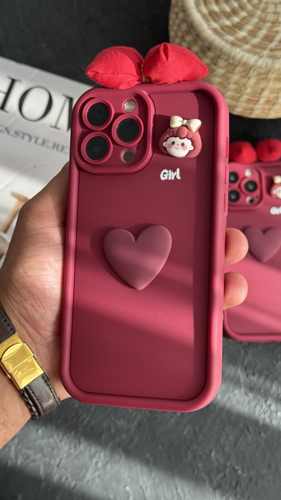 قاب موبایل ( آیفون ) دختر آلبالویی پاپیونی قلب برجسته