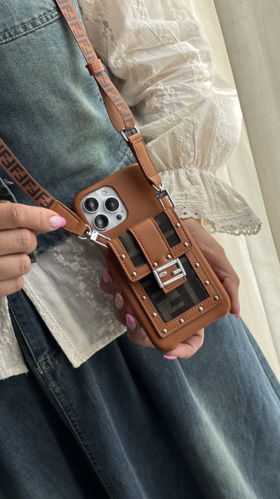 قاب موبایل آیفون فندی چرمی قفل فلزی جاکارتی + بندست بلند