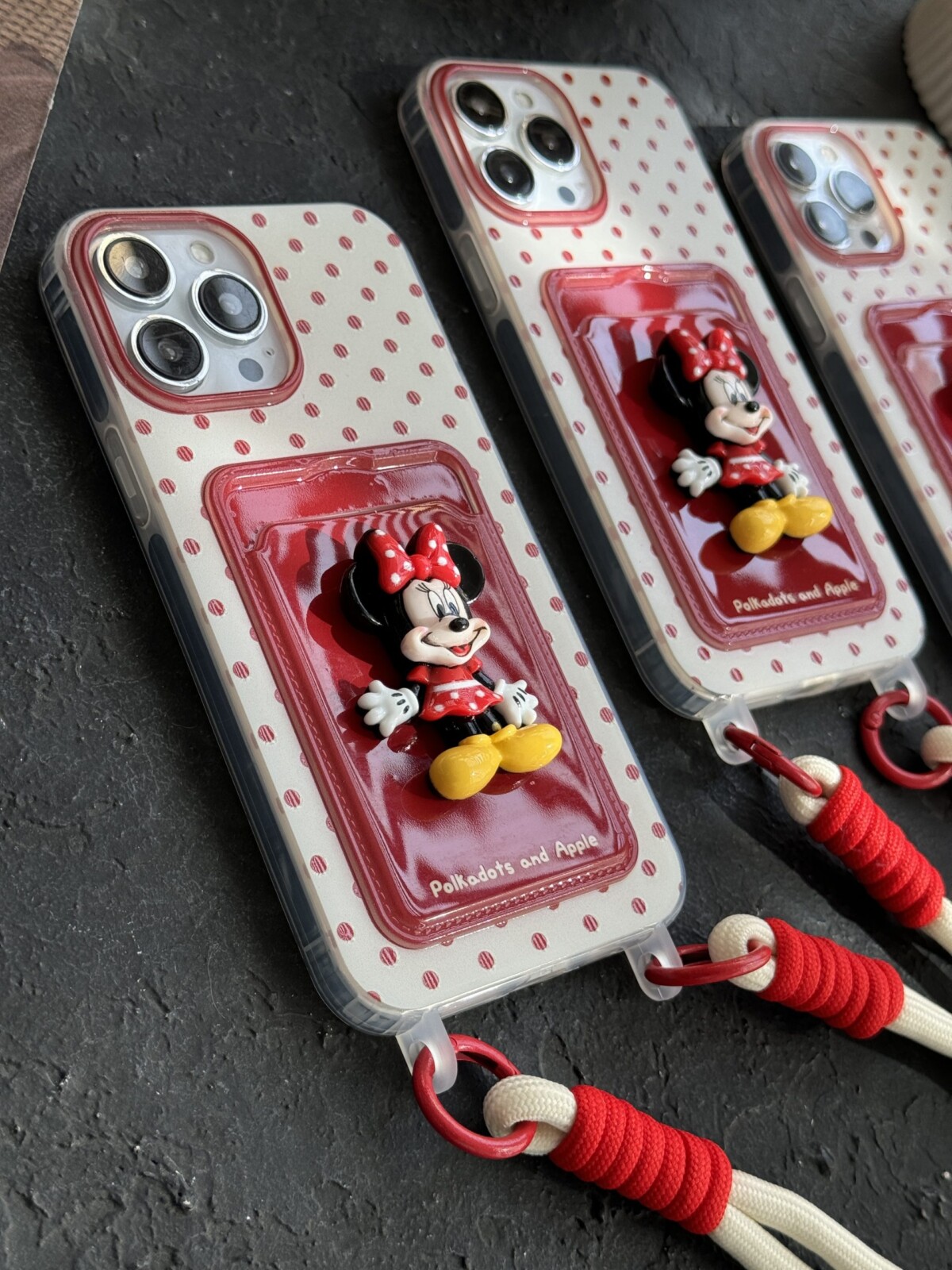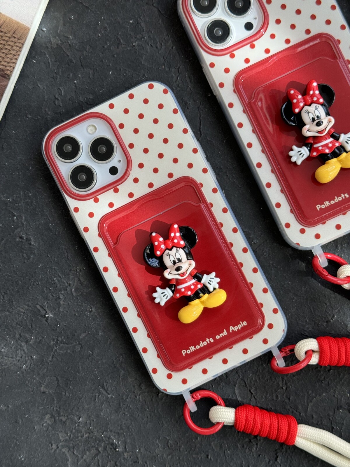 قاب موبایل آیفون میکی برجسته خال خالی جاکارتی بنددار