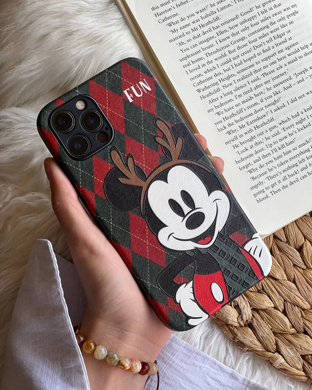 قاب موبایل آیفون میکی موس فان شاخدار چهارخونه سبز و زرشکی محافظ لنزدار