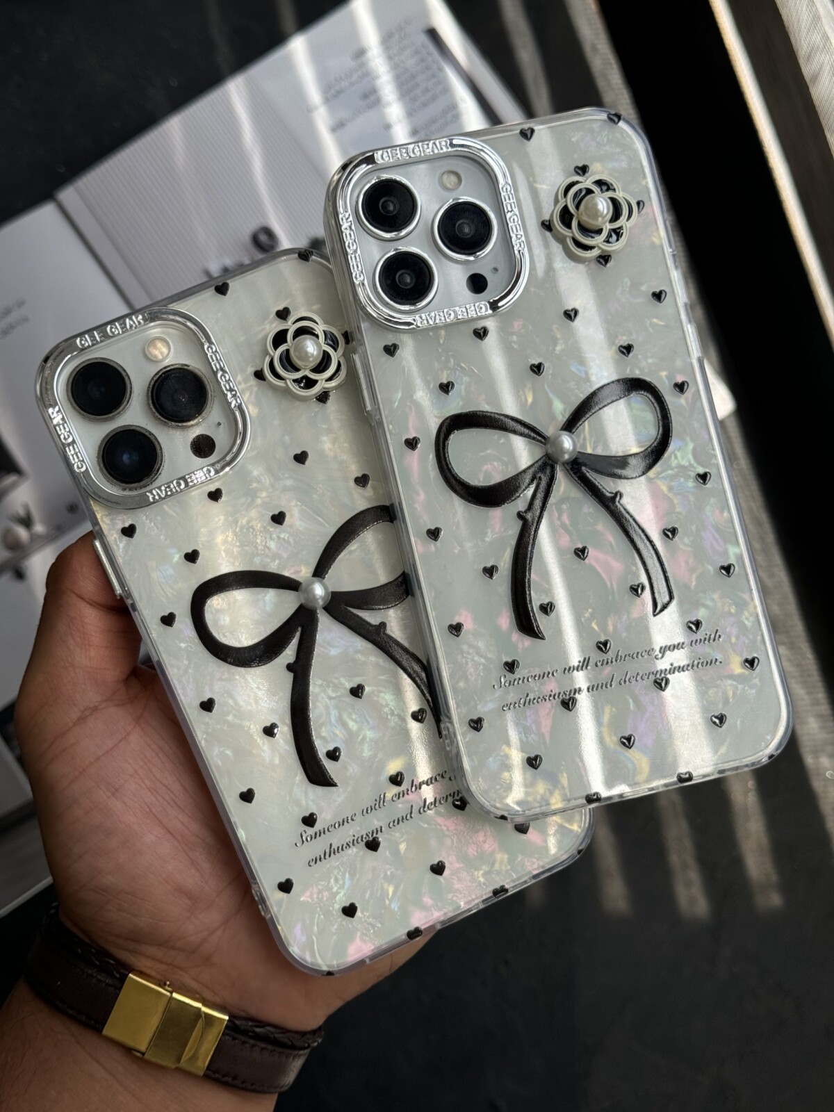 قاب موبایل آیفون پاپیون بزرگ تک مروارید قلب ریز