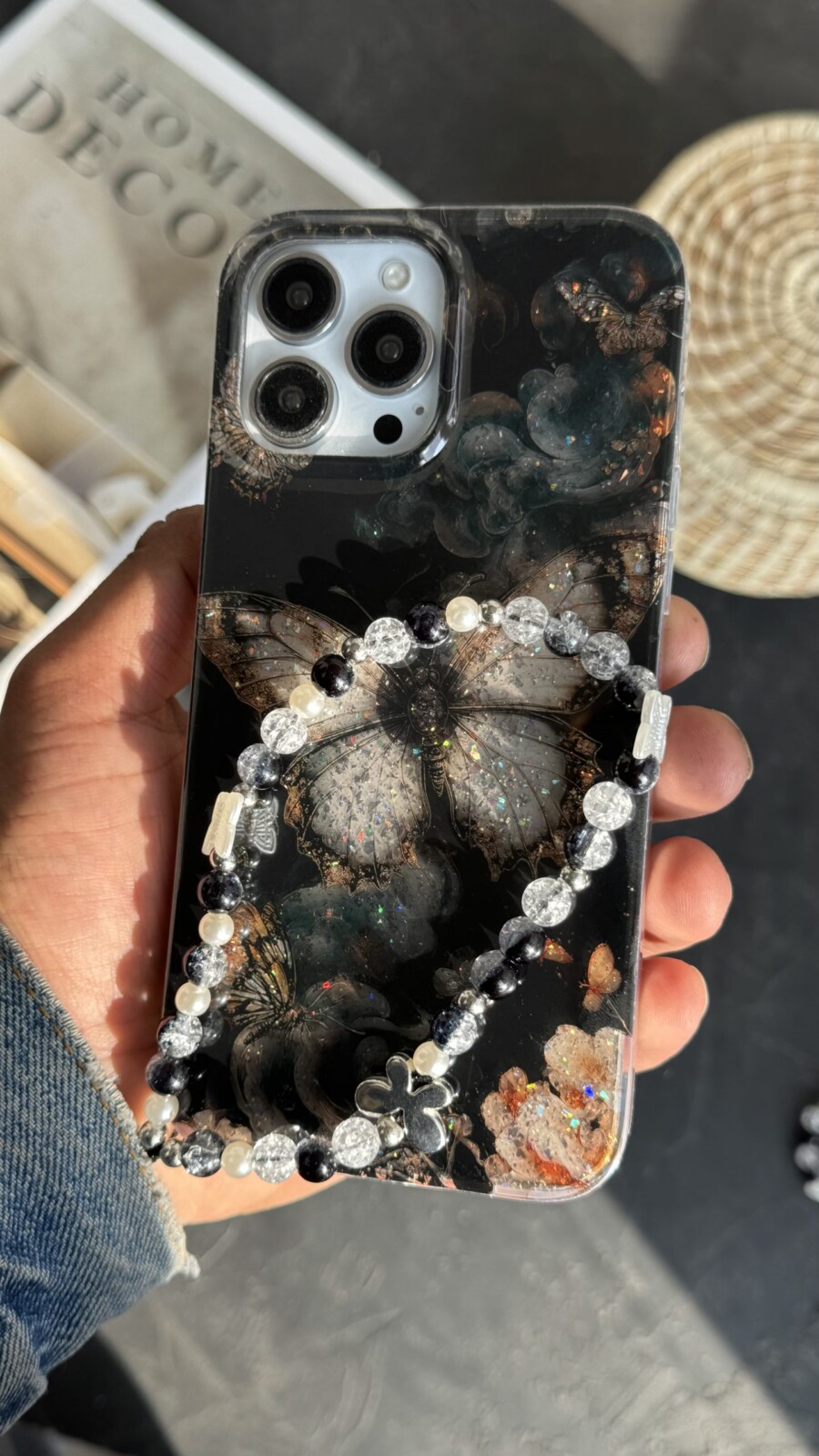 قاب موبایل آیفون پروانه ترنسپرنت مشکی پولکی طلایی
