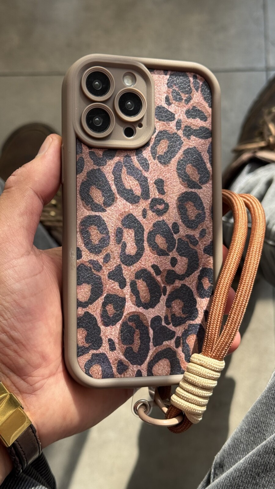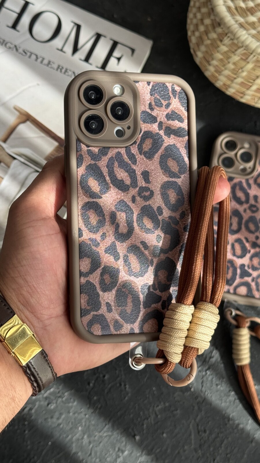 قاب موبایل ( آیفون ) پلنگی سولید قهوه ای + بند ست