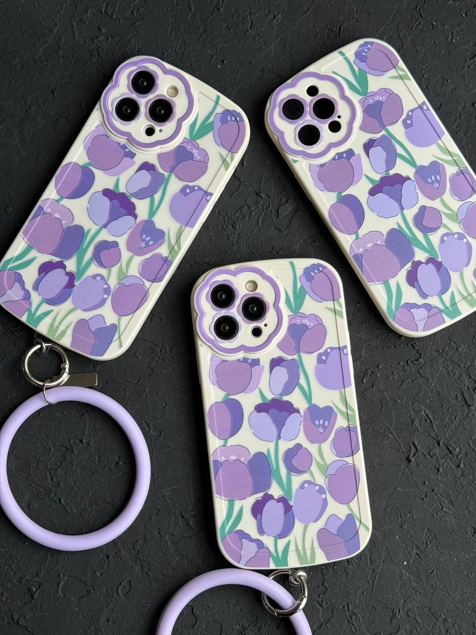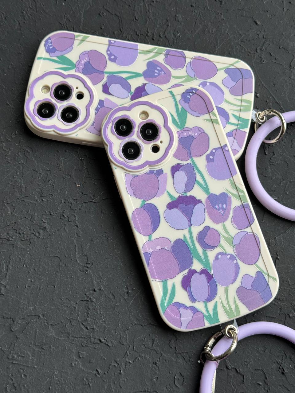 قاب موبایل آیفون گل لاله بنفش محافظ لنز طرح دار + حلقه ست ( 3011 )