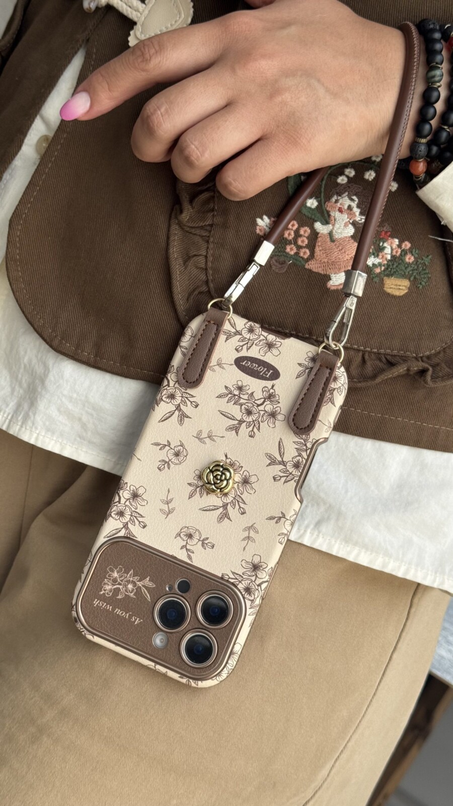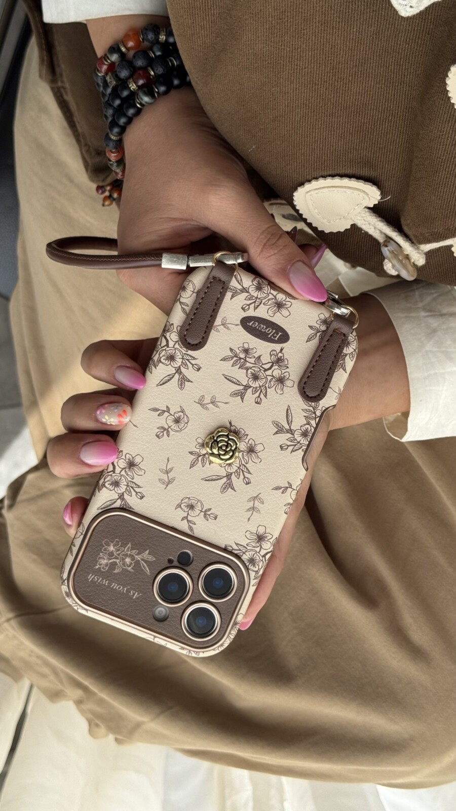 گلهای ریز و ظریف به صورت دقیق روی قاب چاپ شدهاند و رنگهای قهوهای و روشن، هارمونی بسیار چشمنوازی ایجاد کردهاند. این قاب نه تنها یک محافظ گوشی، بلکه یک اکسسوری کامل و شیک است.
