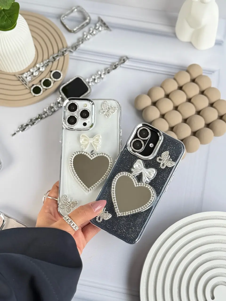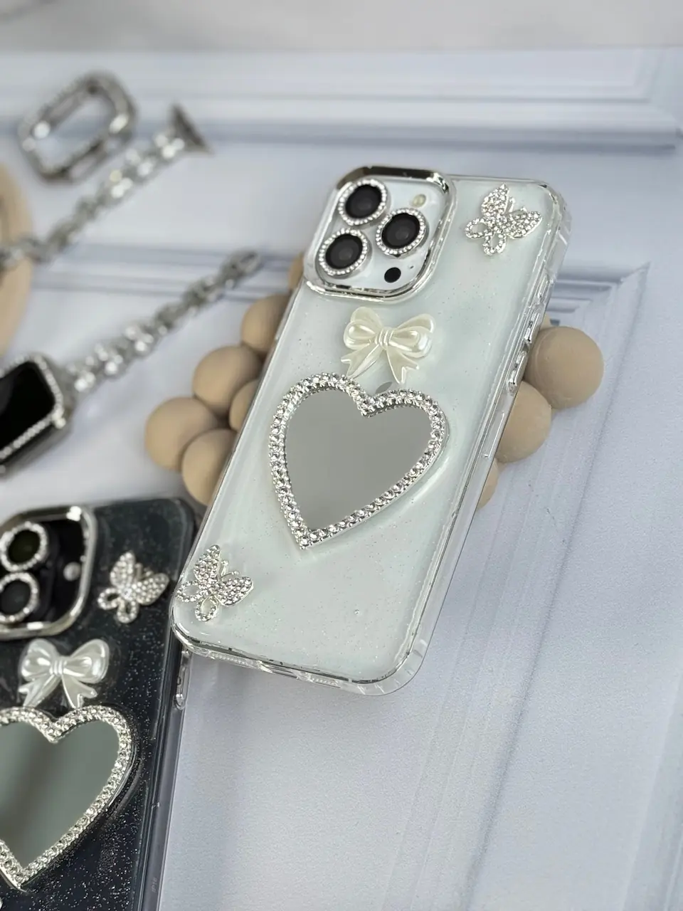 قاب شاینی قلب آینه ای با محافظ لنز رینگی نگینی (کدC1889)